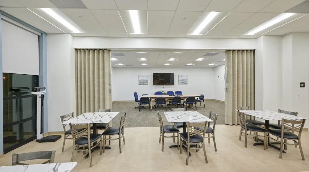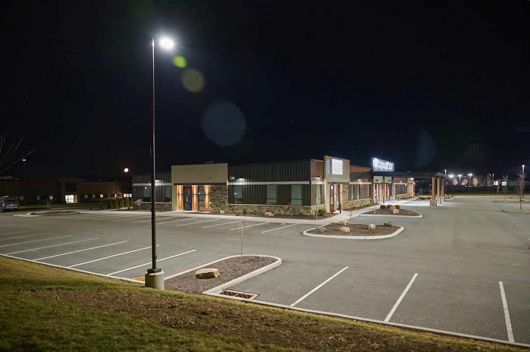 When the sun sets, the experience transforms. Carefully planned downlighting and uplighting highlight key architectural details. Parking lot lighting provides guests with a strong sense of safety while making navigation easy. Illuminated signage ensures the building remains a recognizable landmark even after dusk.